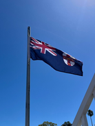 The flag of New South Wales (NSW) is a British Blue Ensign defaced with the state badge. The badge depicts the cross of St George in red on a white disc. At the extremity of each arm of the cross is an eight pointed gold star, and in the centre of the cross is a golden lion passant guardant.