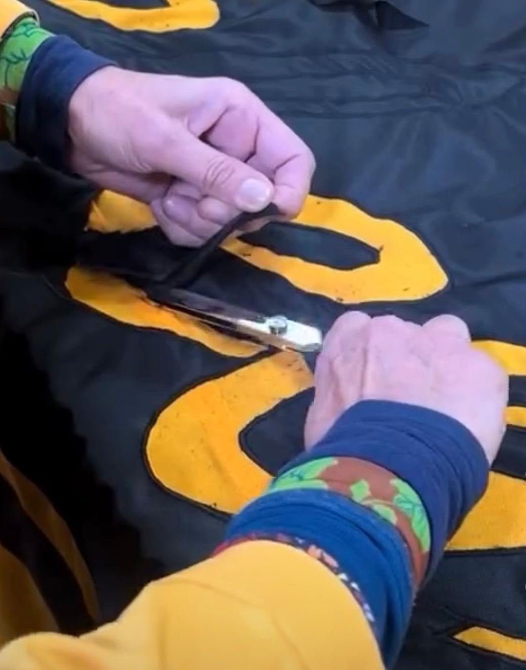 Excess fabric is neatly trimmed to refine the flag's edges and details, enhancing its overall appearance.