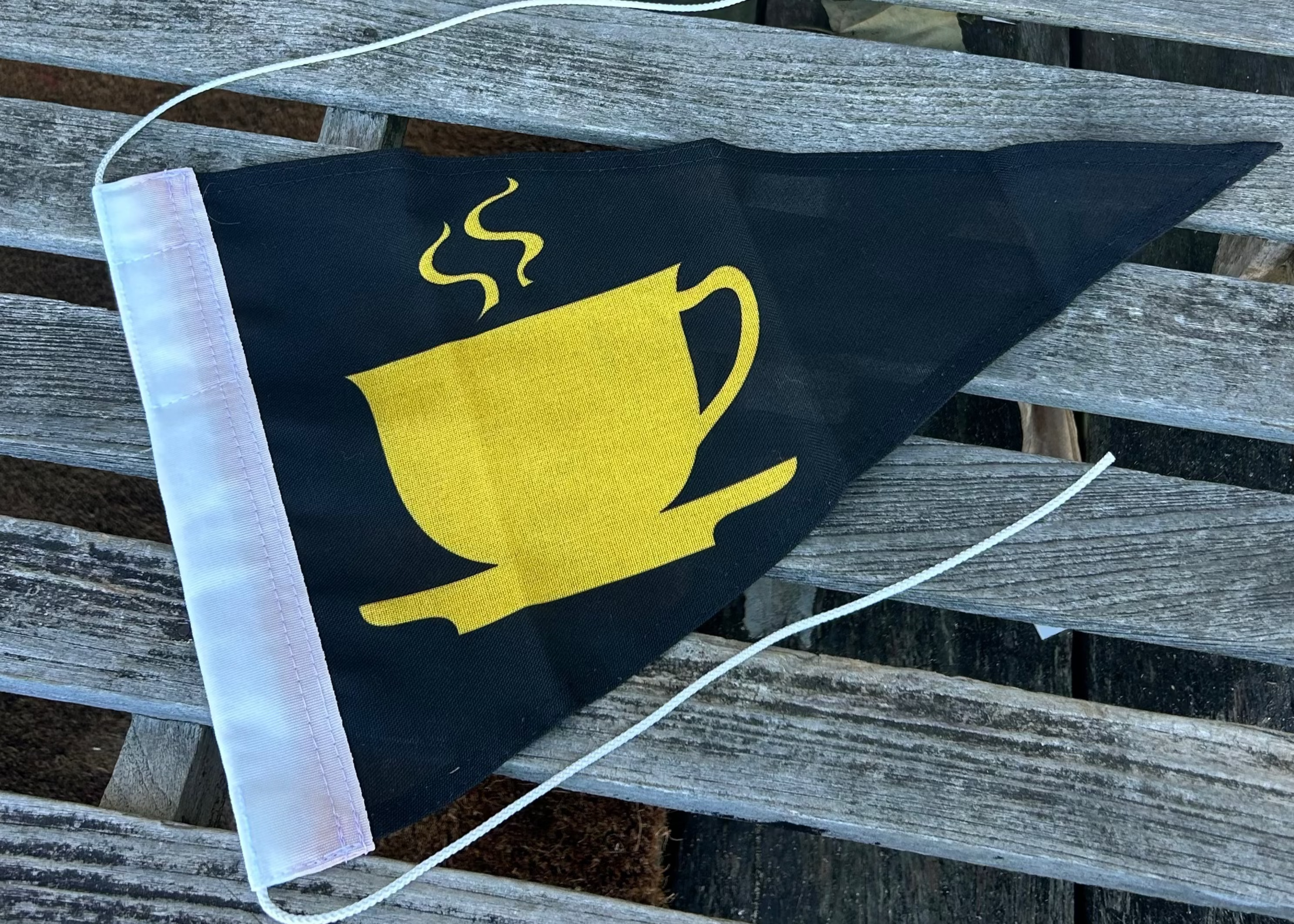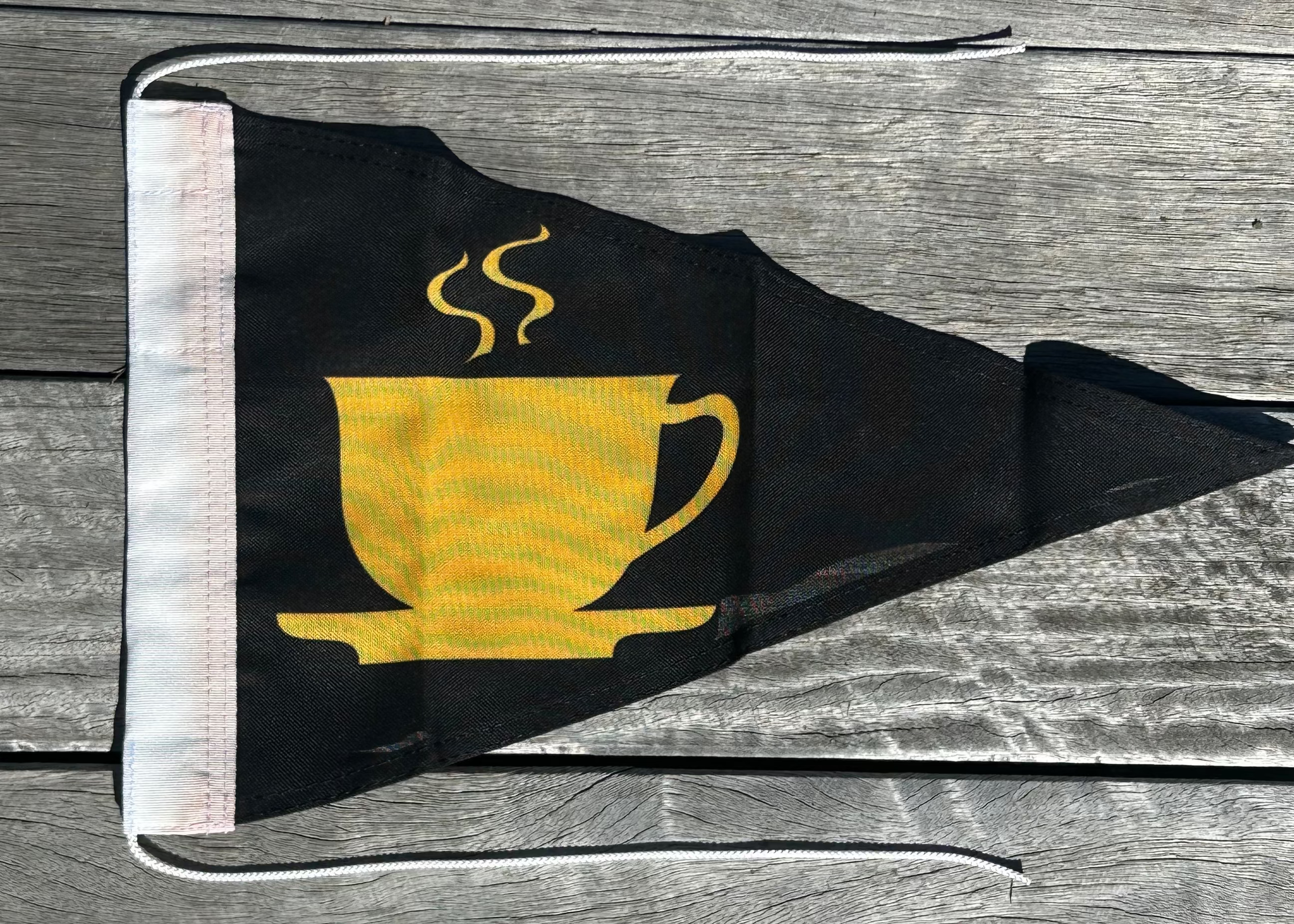 The coffee/tea burgee flag brings the beloved maritime tradition to the triangular burgee format. Inspired by the 'Gin Pennant', this distinctive triangular flag signals to fellow sailors and coffee lovers that the coffee machine is open and you're ready to welcome guests aboard for a warm drink.