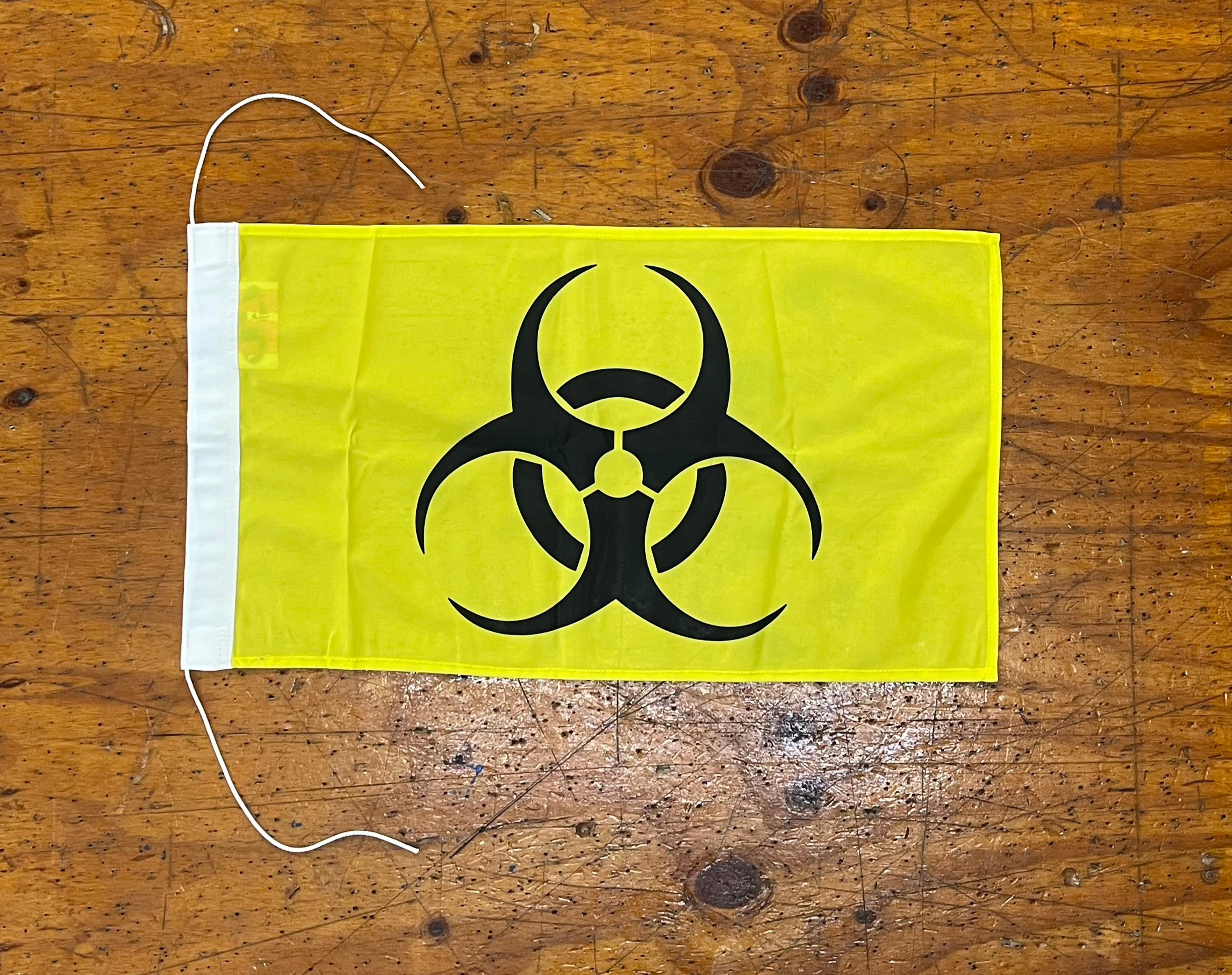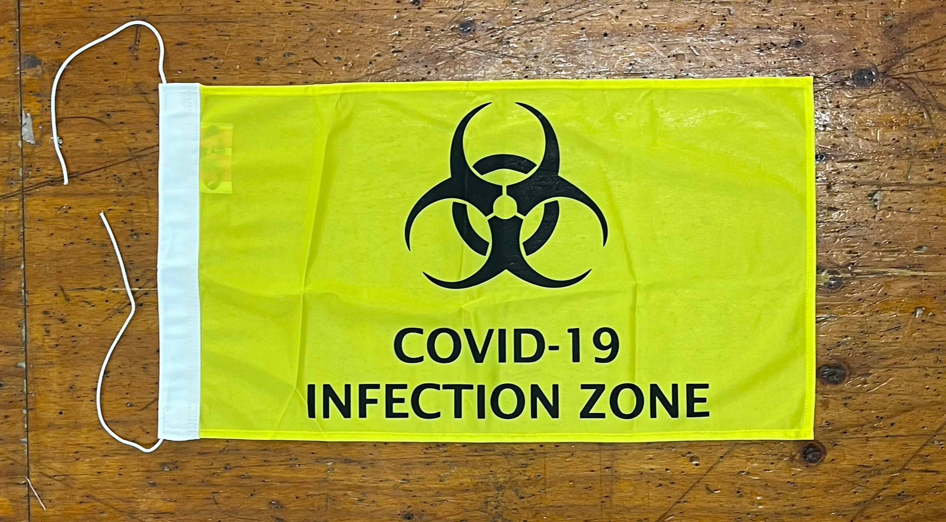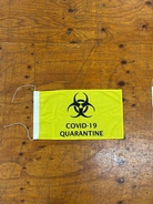 Three types of Covid-19 printed flags, selling at discount due to oversupply.
