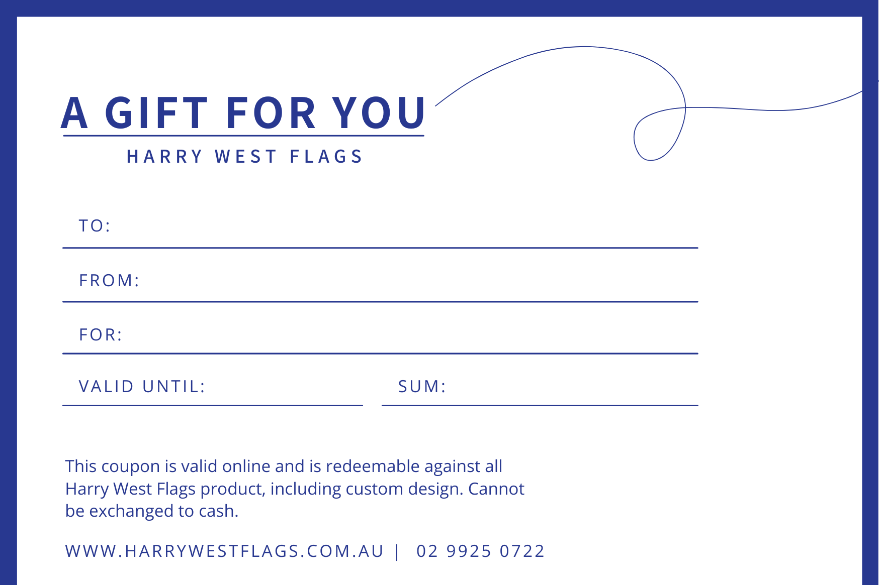 This coupon is valid online and is redeemable against all Harry West Flags product, including custom design. Cannot be exchanged to cash.