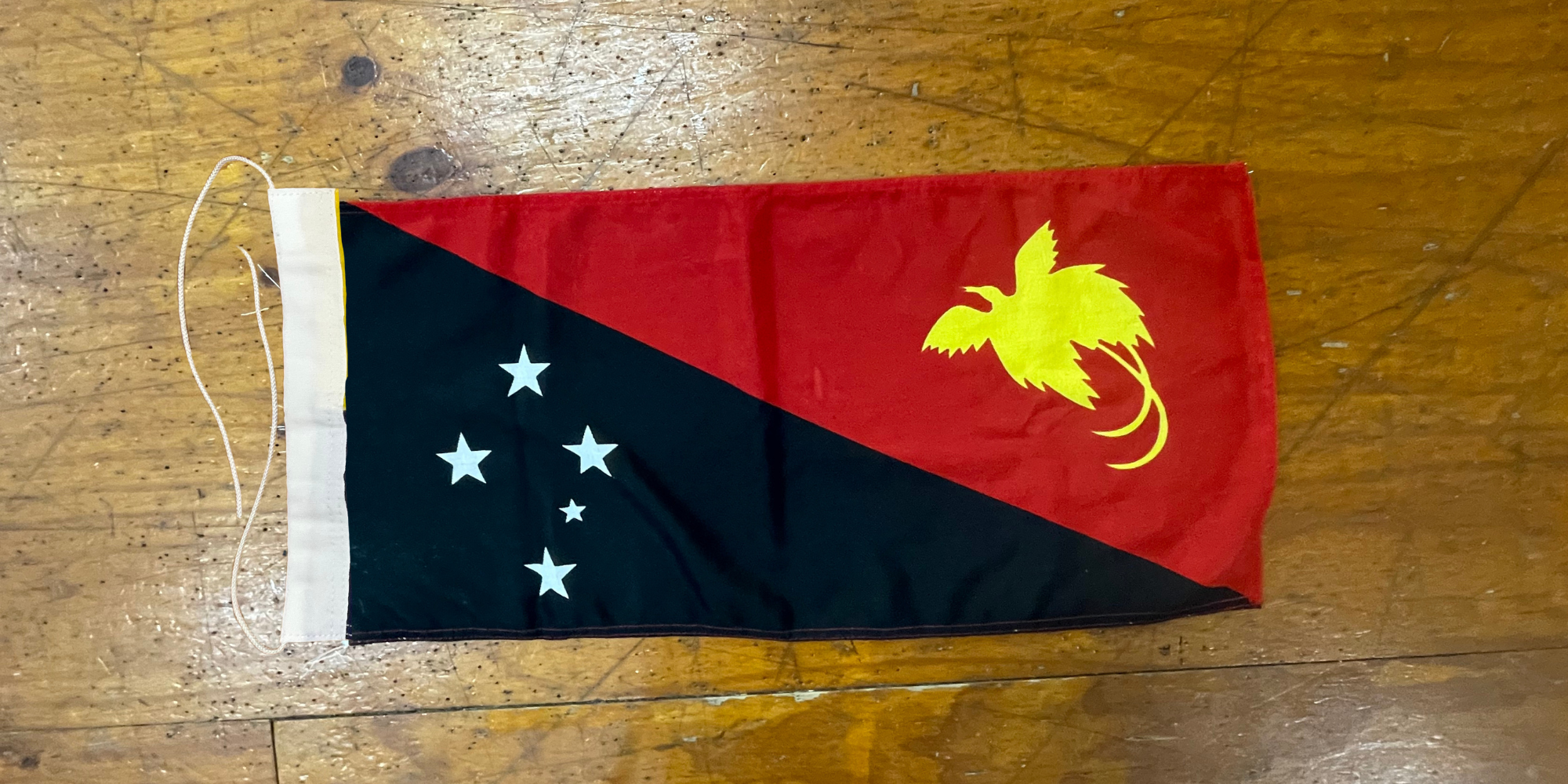 Printed Papua New Guinea Flag measuring 730mm x 360mm, with slight printing imperfections, finished with tail and tail.