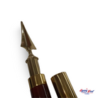 Indoor ceremonial wooden flag pole measures 2.13 metres long and has a diameter of 32mm. It comes in two pieces with 17 cm brass finish finial spear at the top and brass finish at the bottom and centre join.